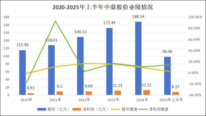 2025年上半年,中鼎股份实现营收98.46亿元,同比增长1.83%,净利润8.17亿元,同比增长14.11%。