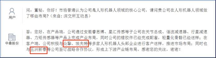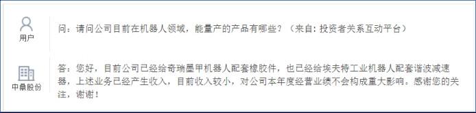 公司在投资者互动平台表示,目前已为奇瑞墨甲机器人配套橡胶件,并为埃夫特工业机器人配套了谐波减速器,且上述业务已经产生了收入。