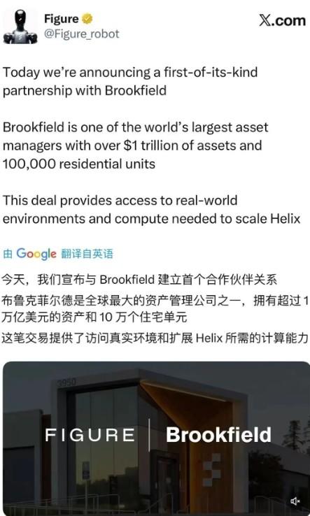 隔日,Figure又宣布其与全球最大的另类资产管理公司Brookfield达成了合作,双方将为Figure 的Helix模型构建最大的预训练数据集,并探索更广泛的基础设施合作。