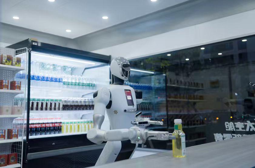完成这些需求的,正是机器人“小盖”。“小盖”身高1.73米,臂长1.9米,它能和周围环境实时互动,可灵活高效完成商品取送等任务,当它举起“手臂”时能抓取货架最上层的商品,而当它“蹲下”时甚至能摸到地面,真正实现无远程遥控、全流程自主运营。