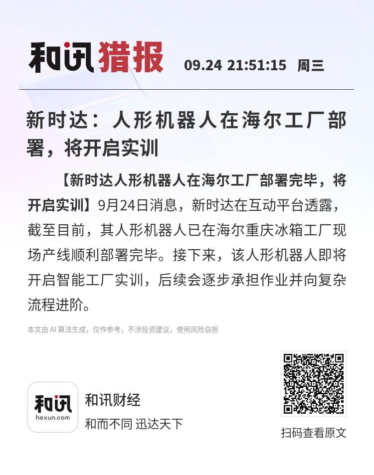 新时达:人形机器人在海尔工厂部署,将开启实训