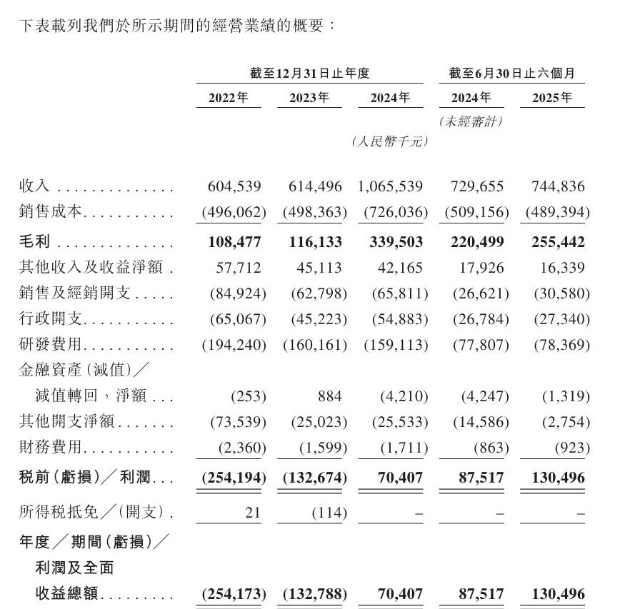招股书显示,2022年、2023年、2024年以及2025年上半年,公司收入分别为6.05亿元、6.15亿元、10.66亿元、7.45亿元,利润分别为-2.54亿元、-1.33亿元、0.70亿元、1.30亿元。