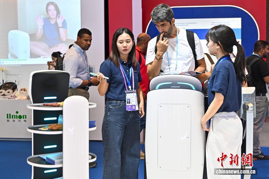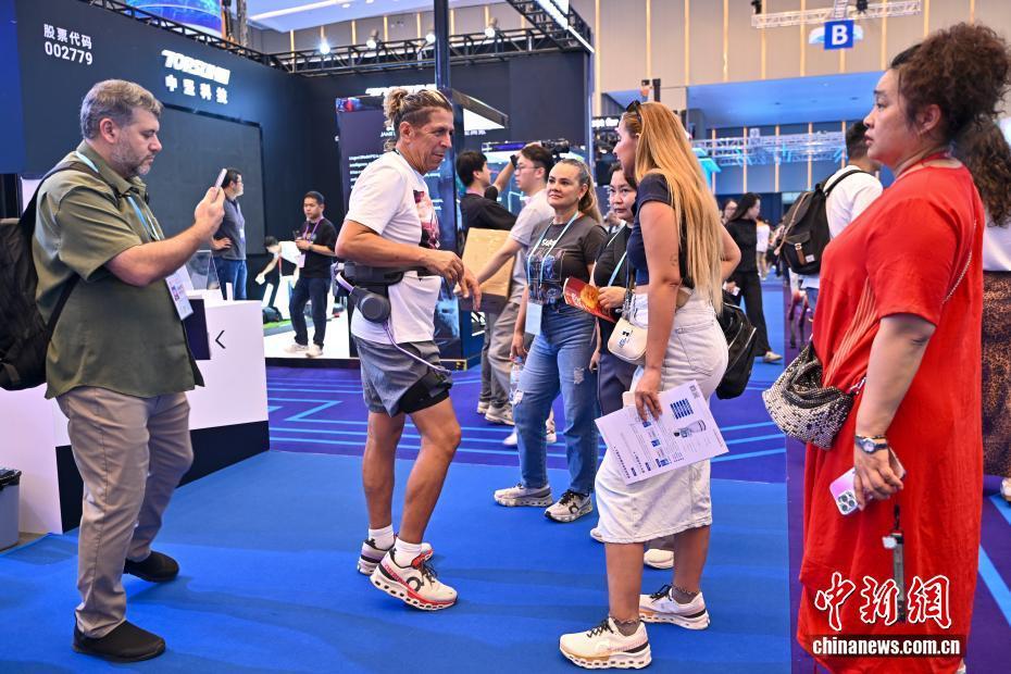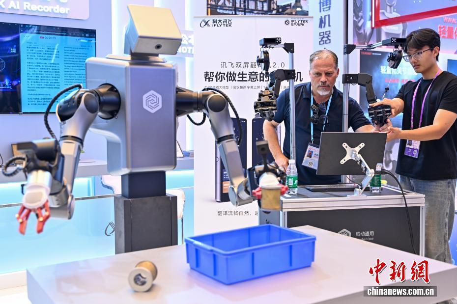 10月15日,第138届中国进出口商品交易会(广交会)在广州开幕。本届广交会第一期以“先进制造”为主题,设立服务机器人专区,聚焦服务机器人前沿,集中展示中国服务机器人最新发展成果。图为采购商体验一款具身智能采训推机器人。中新社记者 陈骥旻 摄