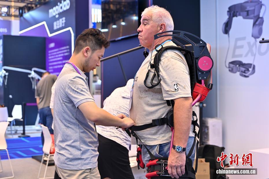 10月15日,第138届中国进出口商品交易会(广交会)在广州开幕。本届广交会第一期以“先进制造”为主题,设立服务机器人专区,聚焦服务机器人前沿,集中展示中国服务机器人最新发展成果。图为采购商体验一款外骨骼助力设备。中新社记者 陈骥旻 摄