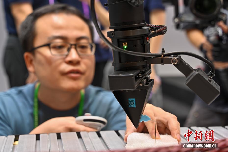 10月15日,第138届中国进出口商品交易会(广交会)在广州开幕。本届广交会第一期以“先进制造”为主题,设立服务机器人专区,聚焦服务机器人前沿,集中展示中国服务机器人最新发展成果。图为参展商操控智能柔性机械臂穿针。中新社记者 陈骥旻 摄