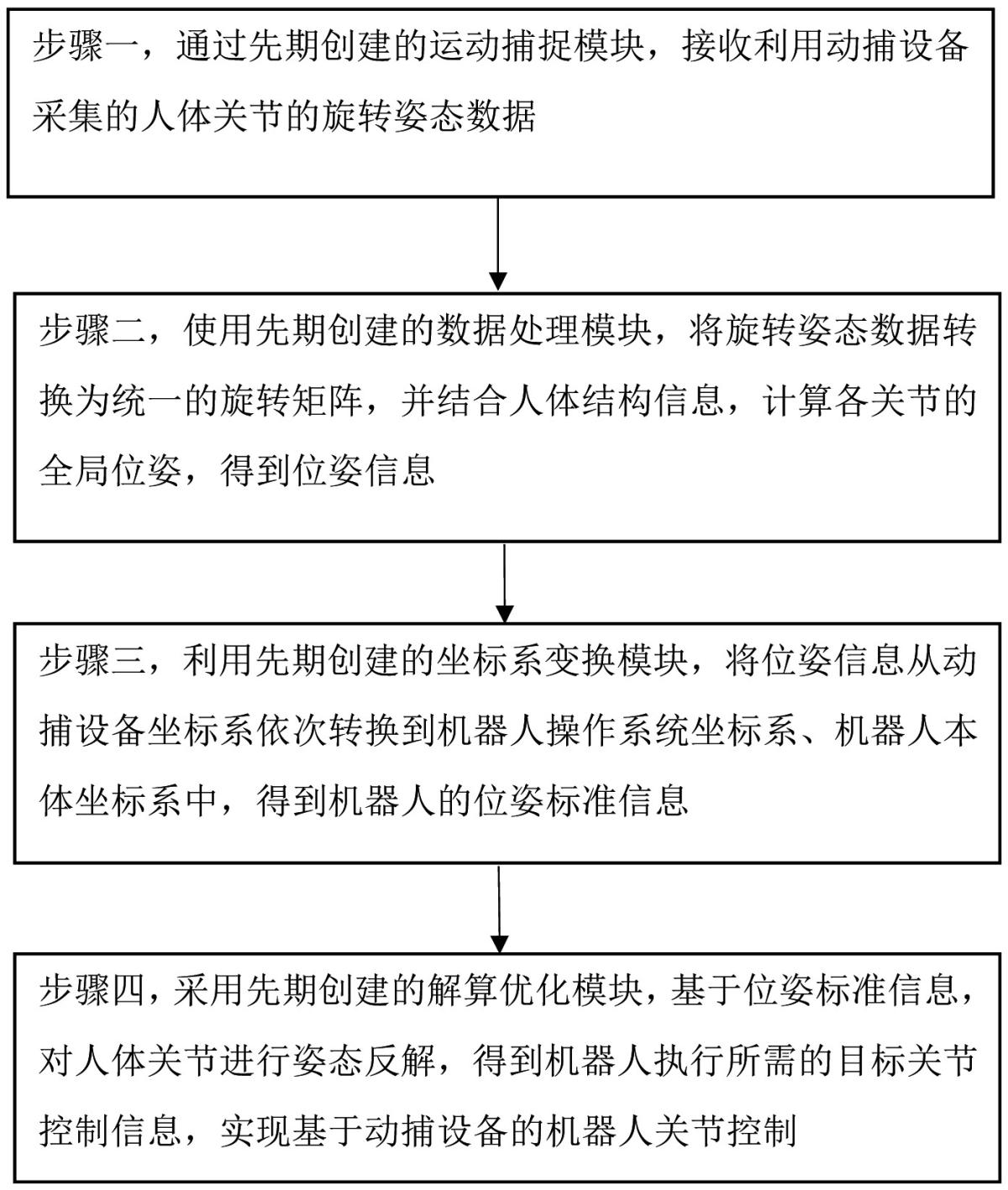 本发明公开了一种基于动捕设备的机器人关节控制方法和系统,属于机器人控制技术领域。现有机器人关节控制方案,缺乏有效的人机协作以及自然交互机制,导致机器人灵活性较差,无法自然地表达操作者的意图。本发明的一种基于动捕设备的机器人关节控制方法,通过构建运动捕捉模块、数据处理模块、坐标系变换模块、解算优化模块,将利用动捕设备采集的人体关节的旋转姿态数据,转化为机器人执行所需的目标关节控制信息,实现基于动捕设备的机器人关节控制,从而可以高效、准确地将人类动作映射至机器人,使得机器人灵活性好,能够有效处理突发动作或复杂协同操作,因而可以自然地表达操作者的意图,实现人机协作以及自然交互。