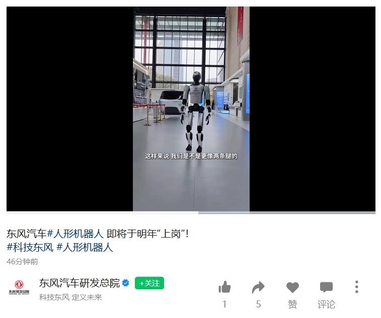 东风汽车两款人形机器人明年“上岗”:一个去工厂,一个去 4S 店