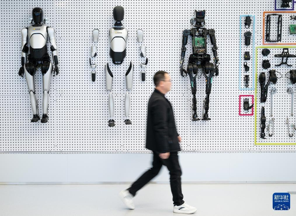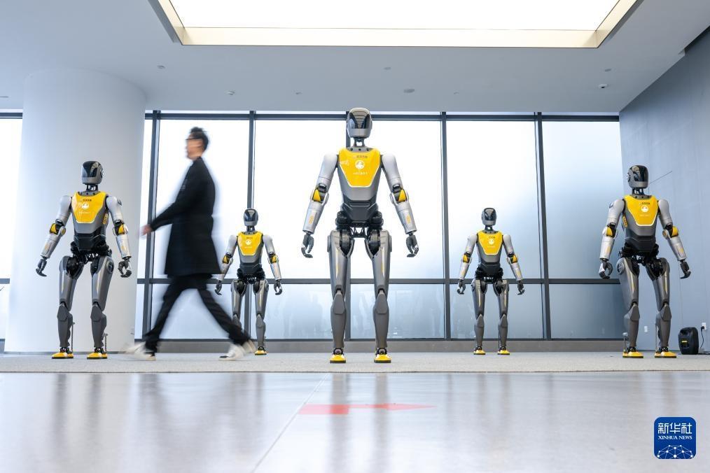 12月4日,在湖北人形机器人创新中心展示厅,参观者从机器人群中走过。