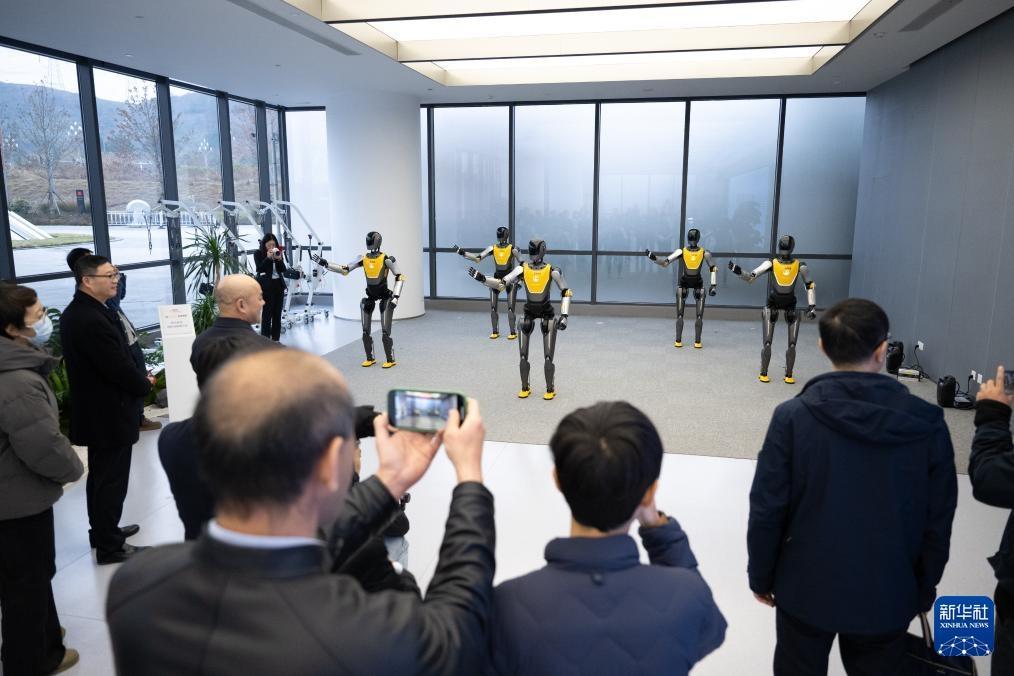 12月4日,在湖北人形机器人创新中心展厅,参观者在观看人形机器人表演。