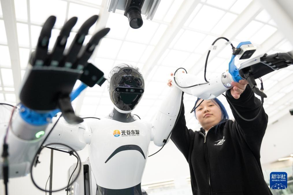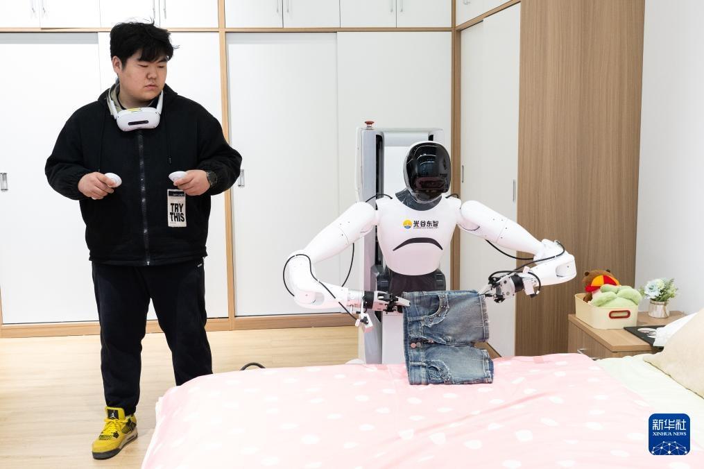 12月4日,在湖北人形机器人创新中心,数据采集员操作人形机器人进行家居场景的数据采集。