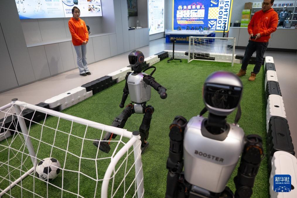 12月4日,在湖北光谷人形机器人7S店,人形机器人进行足球射门表演。