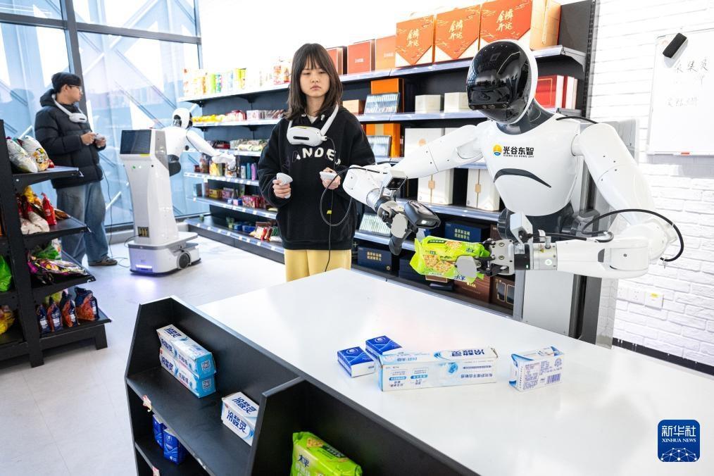 12月4日,在湖北人形机器人创新中心,数据采集员操作人形机器人进行超市场景的数据采集。