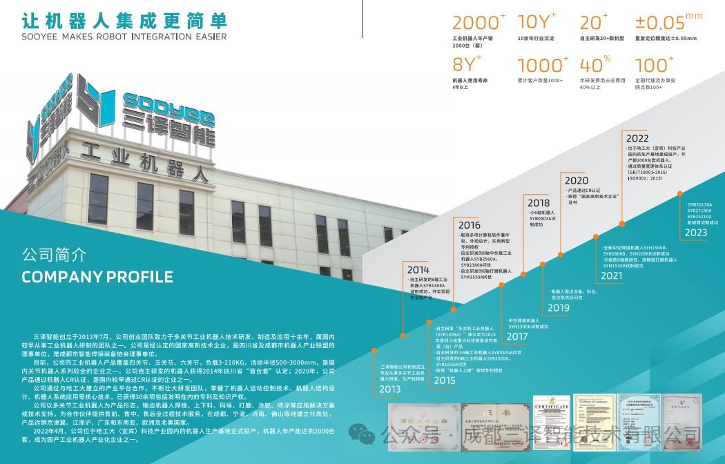 三译智能创立于2013年,专业研发制造多关节机器人及机器人系统,以输出机器人焊接、上下料、码垛、去毛刺、涂胶、喷涂等场景应用解决方案为依托,为合作伙伴提供售前、售中、售后全过程技术服务。目前,三译智能的产品覆盖四轴、六轴3-360KG负载机器人,通过了机器人CR认证,是国内较早通过 CR认证的企业之一。公司位于哈工大(宜宾)科技产业园的机器人生产基地具备年产销机器人数量超过2000台套能力,是国产工业机器人产业化企业之一。