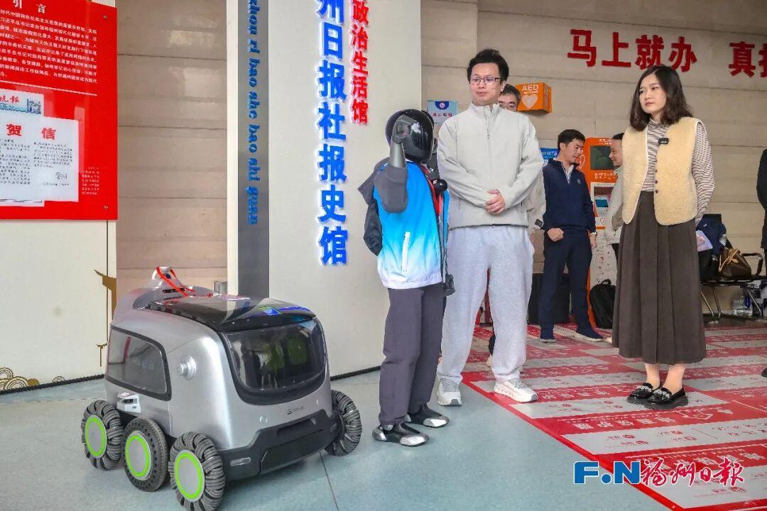 “我的名字叫‘艾白’,号‘四到先生’,‘艾白’福州话意思是明白了,‘四到’就是不叫不到,随叫随到,说到做到,服务周到……”在挂上工作牌正式成为报社员工后,艾白先来个开场自我介绍。随后,艾白和溜溜两位“新员工”配合默契、无缝对接,“艾白”当起迎宾礼仪,带领着众人步入福州日报社报史馆,紧接着将讲解的接力棒交给“溜溜”。“溜溜”一边领众人参观福州日报社报史馆,一边为大家讲解,有模有样扮演着讲解员的角色。