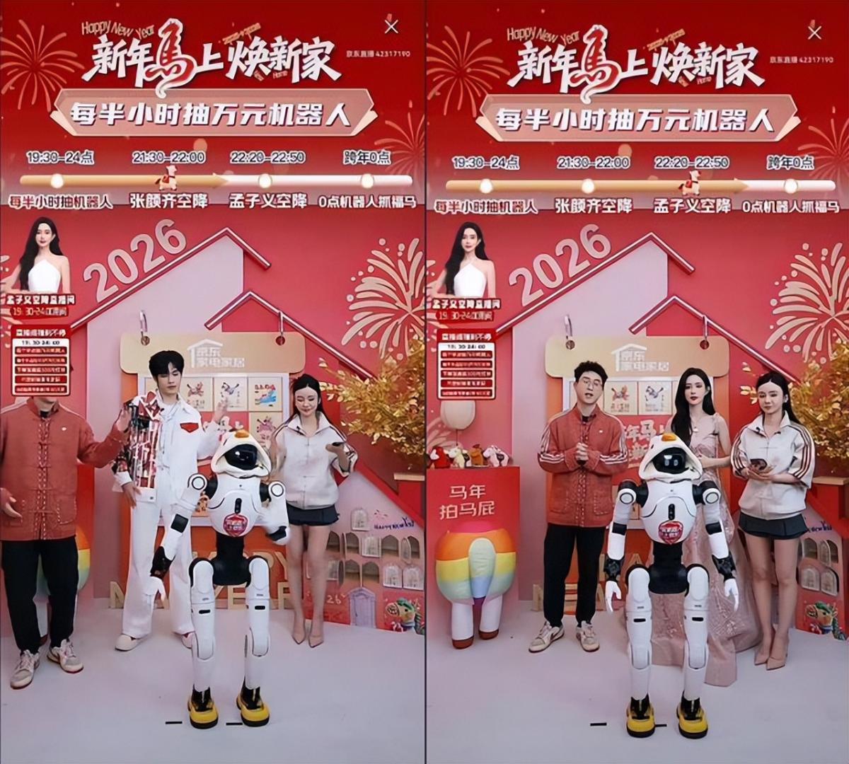 在京东直播间中,智元远征A2和孟子义唱歌接龙,一不小心唱歌“走调”,在线展示高情商;与张颜齐一起送上川味儿祝福,连词成句、即兴说唱、夸夸老己……样样能行。除了展示语言实力,远征A2还现场撰写了“马上有钱”、“抓马”等新春祝福送给大家。灵犀X2则和孟子义、张颜齐斗舞,把直播间的气氛拉满。