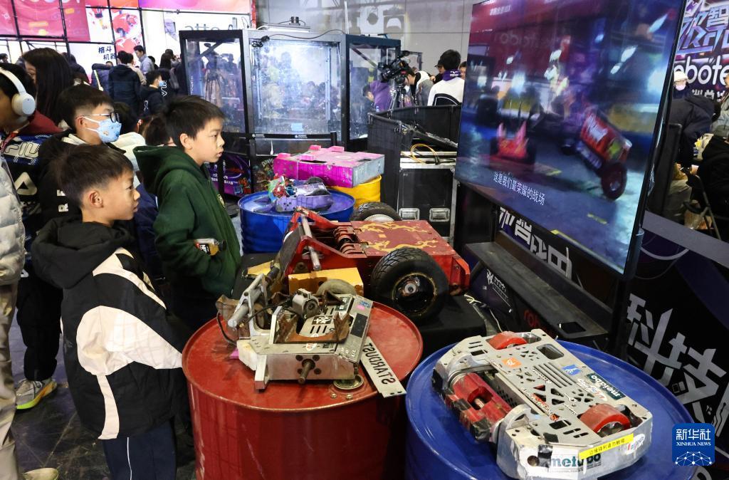 1月2日,参观者在一组参加机器人格斗比赛的机器人展品前驻足观看。