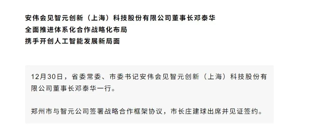 12月31日,市委领导会见智元创新董事长邓泰华一行,郑州市与智元公司签署战略合作框架协议。