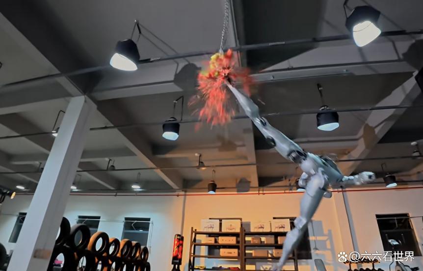 这还不是全部。紧接着,机器人又展示了“空中回旋倒立踢”,将悬挂在高处的西瓜凌空踢得粉碎,随后更是将60公斤和120公斤的沙袋踢出半米开外。