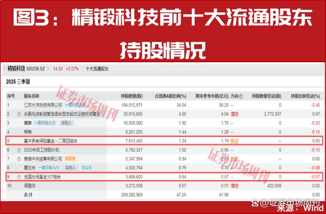 如精锻科技,2025年三季度末,养老保险基金一二零四组合、社保基金107组合分别以761.54万股、366.86万股的持仓位列公司第五大、第九大流通股股东,相较二季度末,社保基金107组合为继续重仓,养老保险一二零四组合则为新进重仓(见图3)。