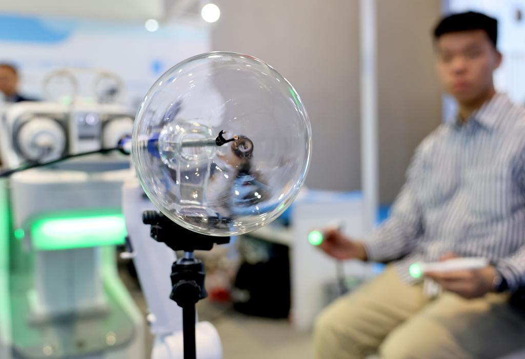 在上海举行的第91届中国国际医疗器械博览会(CMEF)上,工作人员现场通过智能笔对一个全柔性微型内镜手术机器人进行操控演示(2025年4月8日摄)。新华社记者方喆 摄