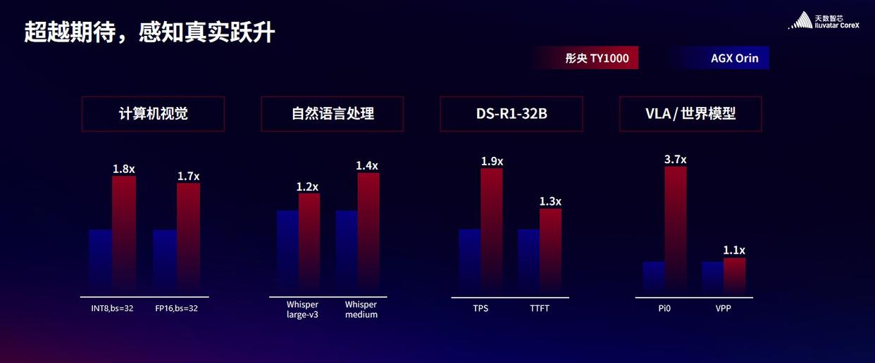 天数智芯方面指出,在计算机视觉、自然语言处理、DeepSeek 32B 大语言模型、具身智能VLA模型及世界模型等多个场景的实测中,彤央TY1000的性能全面优于英伟达AGX Orin。