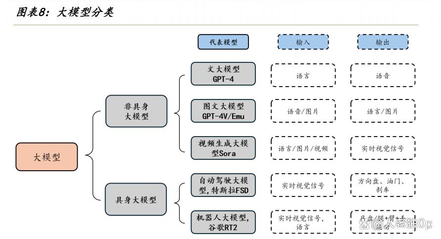 目前限制人形机器人大规模量产的重要因素是大脑进化。机器人逻辑架构由“大脑”+“小脑”+肢体组成,目前人形机器人“肢体”硬件方案趋于收敛,硬件发展整体走在软件之前。目前人形机器人“大脑”技术以大模型为核心,为人形机器人提供任务级交互、环境感知、任务规划和决策控制能力。伴随着 Ai 大模型的迭代,机器人大脑实现产业实现跨越式发展,智能化程度有望提升。