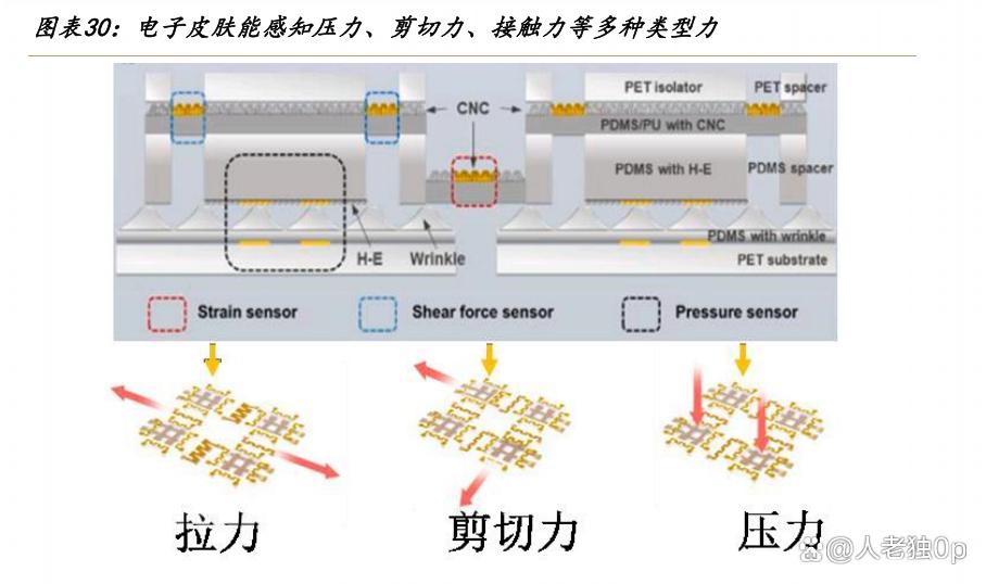 电子皮肤是是新型的仿生柔性触觉传感系统,通过柔性传感器进行信号感知转换。从表面的接触方向来看,电子皮肤能够感知压力、剪切力、接触力等多个类型的力,能够助力机器人在手部实现更加精细的操作。电子皮肤主要分为基底层、导电层、传感层。