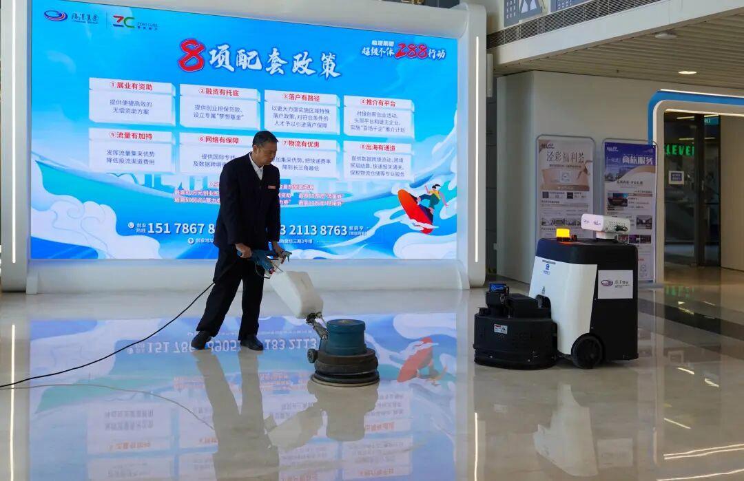 此次机器人落地应用,是多方协同、供需精准对接的成果。临港漕河泾物业作为园区服务领军企业,一直致力于通过技术创新提升运营效能与服务品质,传统石材晶面养护的痛点愈发凸显:人工养护属于技术工种,需要专业师傅操作,单次价格较高且人工打磨亮度仅能维持在80度左右,难以满足高端园区的环境标准。为破解这一难题,在漕河泾管理公司科创人才事业部与人形机器人创新孵化器的助力下,临港漕河泾物业成功对接孵化器企业派特纳(上海)机器人科技有限公司(以下简称“派特纳”),引入专业晶面养护设备。