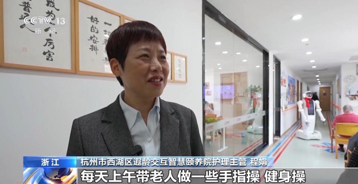 杭州市西湖区遐龄交互智慧颐养院护理主管 程娟:这个机器人叫“柔擎”,老人特喜欢。每天上午带老人做手指操、健身操。天天有“柔擎”陪伴,他们感到很新鲜。