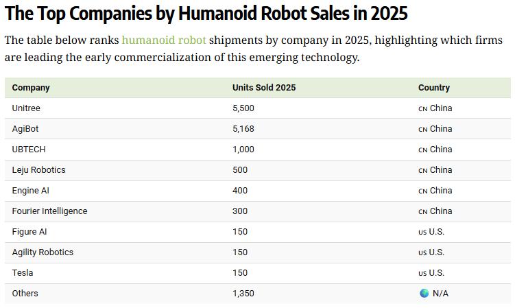 2025年,特斯拉交付了150辆Optimus,预计将于2027年开始公开销售。同样,其他美国领先公司 Figure AI 和 Agility Robotics 的出货量也大致相同。尽管迄今为止交付量有限,Figure Ai 的估值仍飙升至 390 亿美元,远高于 2024 年的 26 亿美元。中国凭借完善的供应链体系、核心技术自主化突破及多场景落地优势,稳居全球人形机器人产业第一大国。