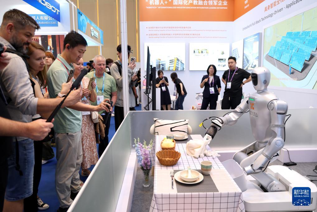 4月15日,境外采购商在广交会上观看机器人模拟收拾餐桌。