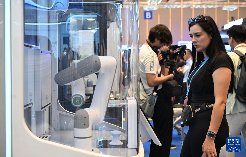 4月15日,境外采购商在广交会上观看自动冰激凌机器人。