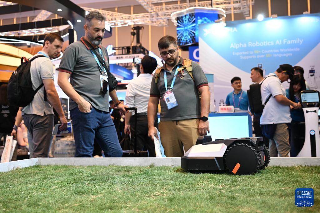 4月15日,境外采购商在广交会上观看一款除草机器人。