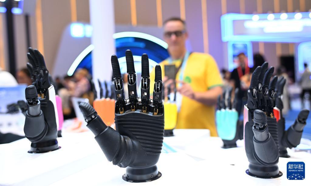 4月15日,境外采购商带着孩子在广交会上和灵巧手互动。