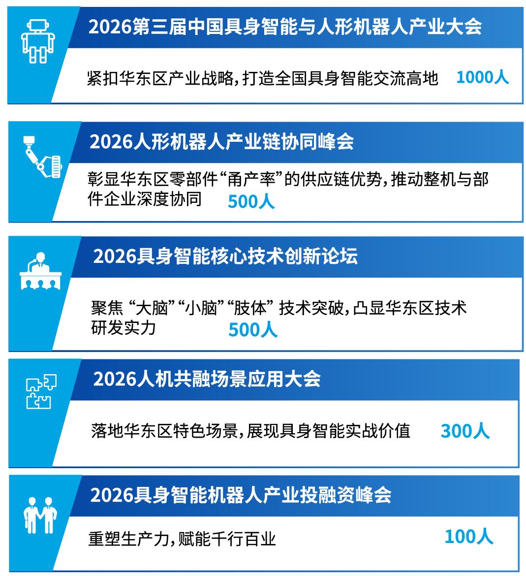 2026第三届中国具身智能机器人产业大会暨展览会(杭州)将搭配“两会两展+行业发展论坛+新产品新技术发布会"的模式,构建“会、展、技术、趋势”四位一体的核心平台体系,重点邀请具身智能头部企业参与,展示人形机器人、陪伴机器人、工业机器人等相关应用,在这个充满机遇与挑战的时代,让我们共同拥抱A1,携手创造更加美好的未来。